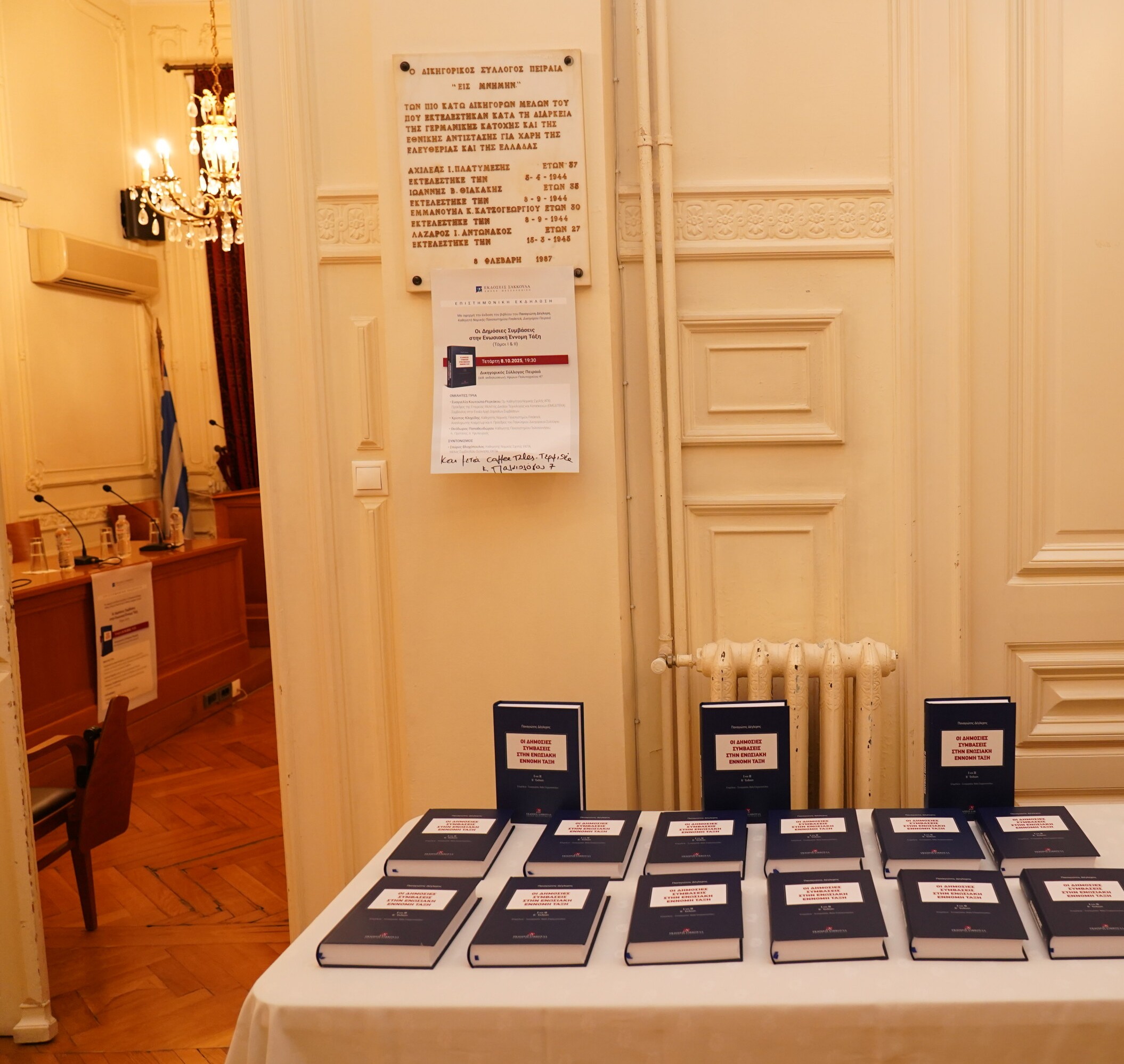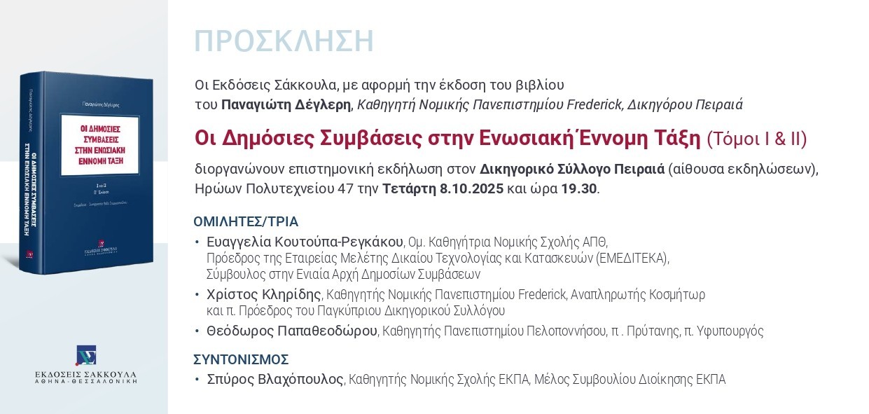 Παρουσίαση του βιβλίου: "Οι δημόσιες συμβάσεις στην ενωσιακή έννομη τάξη (τ. Ι και ΙΙ), Β΄ Έκδοση", στην αίθουσα εκδηλώσεων του Δ.Σ.Π. στις 8.10.2025